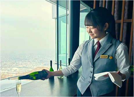 この仕事の魅力は、誕生日・プロポーズ・記念日など、お客さまの大切なひとときのお手伝いができることです。お客さまの笑顔を見たり、喜んでいただけた時には非常にやりがいを感じますし、札幌を代表する施設のレストランで働いていることに誇りを持っています。